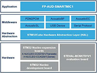 STMicroelectronicsin FP-AUD-SMARTMIC1 on STM32Cube-toimintopaketti. Tämä ohjelmistopaketti toteuttaa täydellisen sovelluksen, joka on kohdistettu MEMS-mikrofonijärjestelmien edistyneeseen käsittelyyn, mukaan lukien digitaalinen MEMS-mikrofonien hankinta, säteenmuodostus, lähteen lokalisointi ja akustinen kaiunpoisto. Käsitelty ääni lähetetään USB-isäntään ja kaiuttimeen, joka on kytketty asianomaisiin laajennuskortteihin.