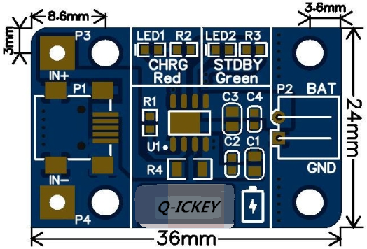 3,7 V litium-akkujen latausmoduuli-TP4056, moduuli käyttää TP4056-sirua ytimenä, voidaan saavuttaa täydellinen yksittäinen litium-ioni-akku vakiovirran / vakiojännitteen latauksella, latausvirta I = 1200 / R1 = 1A (riittävän tulon tapauksessa) teho). Moduulissa on latausvalo ja valmiustilan merkkivalo, ja latauksen merkkivalo LED1 (punainen) palaa latauksen aikana; kun LED1 ei pala, kun se on täysin ladattu, valmiustilan LED LED2 (vihreä) palaa; kun paristoon ei pääse, LED2 palaa ja LED1 vilkkuu taajuudella 1-4S. Moduulissa on alijännitteen lukitustoiminto ja automaattinen lataustoiminto. Kun tulolähteen VCC on alle 3,7 V, TP4056 on sammutustilassa. Kun akun jännite laskee alle 4,05 V (latauksen jälkeen noin 80% - 90% akun kapasiteetista), latauksen jälkeen käynnistyy uudelleen.