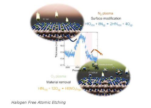 Nagoya-yliopiston Shih-Nan Hsiaon ja Masaru Horin johtama tiimi yhteistyössä Ming Chi -yliopiston kanssa, suunnitteli kaksivaiheisen syklisen menetelmän, joka korvaa halogeenit typpi- ja happea plasmoilla.Ensimmäisessä vaiheessa n⁺ -ionit pommittavat HFO2 -pintaa, sitoen typpeä kalvoon.Toisessa O2-plasma poistaa typpisidotun kerroksen itserajoittavan reaktion kautta.Jokainen sykli poistaa vain 0,023 - 0,107 materiaalia nanometrit, mikä mahdollistaa subatomisen tarkkuuden.