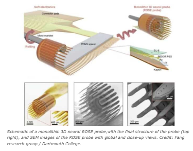 Perinteiset hermostokoettimet, jotka on rakennettu jäykille puolijohdeprosesseille, rajoittuvat tasaisiin elektrodijärjestelyihin rajoittaen kuinka monta neuronia he voivat seurata samanaikaisesti.Rose -lähestymistapa tuottaa sen sijaan tiheät elektrodihankoihin upotetut joustaviin lieriömäisiin rakenteisiin, viritettävällä etäisyydellä, sävelkorkeudella ja nauhoitussyvyydellä.Suunnittelu muistuttaa ”sveitsiläistä rullaa”, jossa jokainen ulospäin suuntautuva varsi toimii elektrodina.Tämä joustavuus sallii satoja nauhoituspaikkoja yhdellä koettimella sieppaamalla hermostoaktiivisuutta useilla syvyyksillä ja minimoimalla tulehduksen.