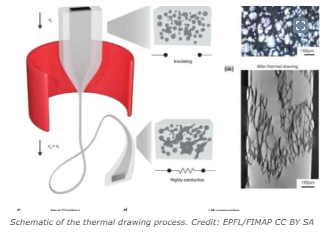 École Polytechnique Fédérale de Lausannen (EPFL) tutkijat ovat kehittäneet uudenlaisen "elektroniikkakuidun", johon on upotettu huoneenlämpöisen nestemäisen metalliseoksen pisaroita ja joka pysyy luotettavasti johtavana jopa yli kymmenen kertaa alkuperäiseen pituuteensa venytettynä.